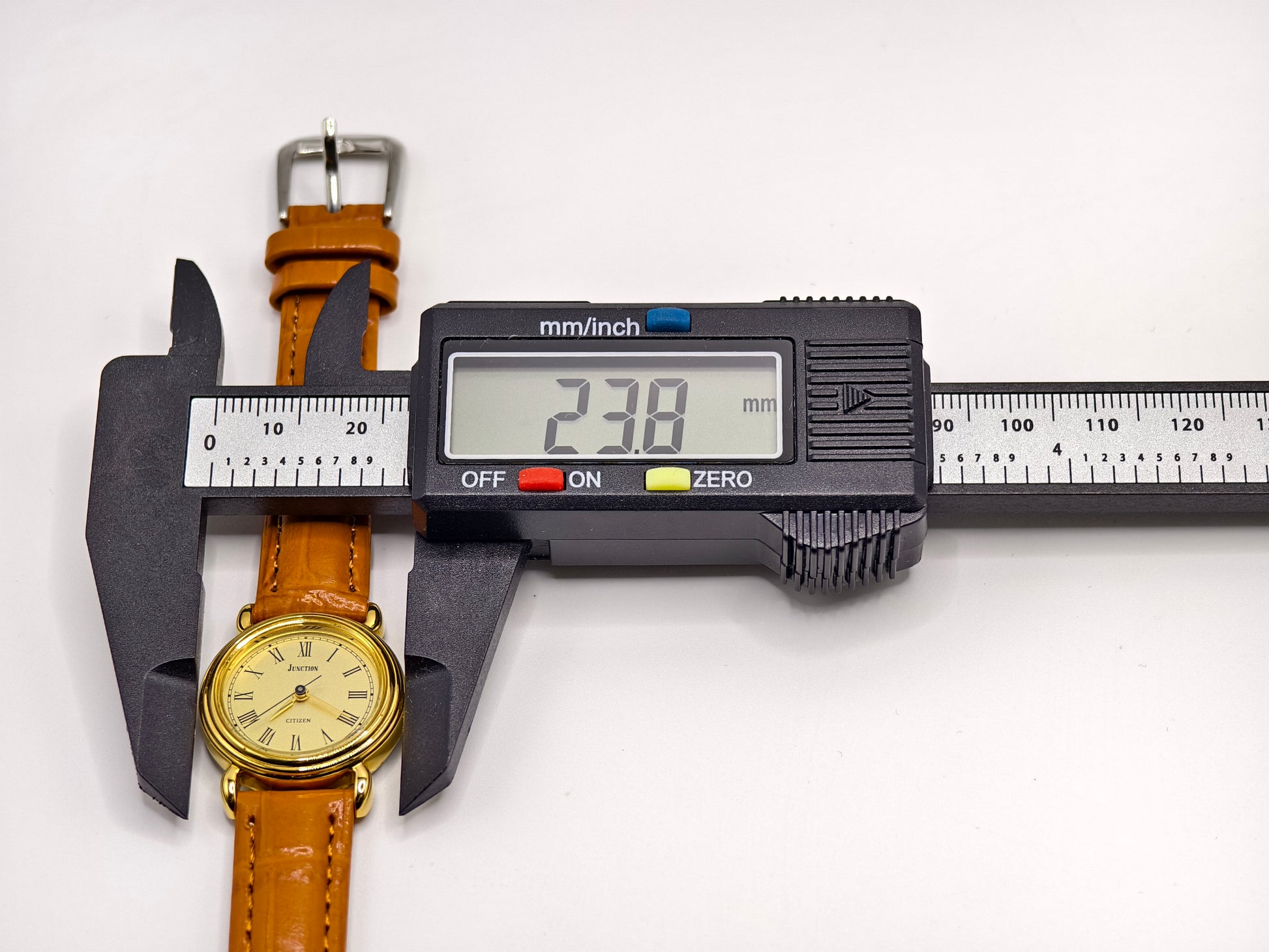 A charming vintage Citizen Junction ladies watch with a classic European look—gold-tone round case, Roman numerals, and a warm champagne dial. The petite 23.8 mm size wears elegantly and pairs well with the included tan leather strap for a timeless dress style. The reliable quartz movement is running and keeping time in our short test.