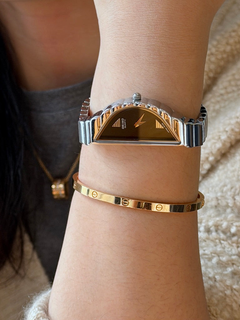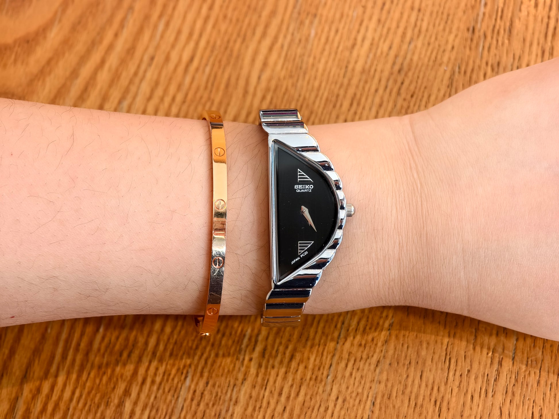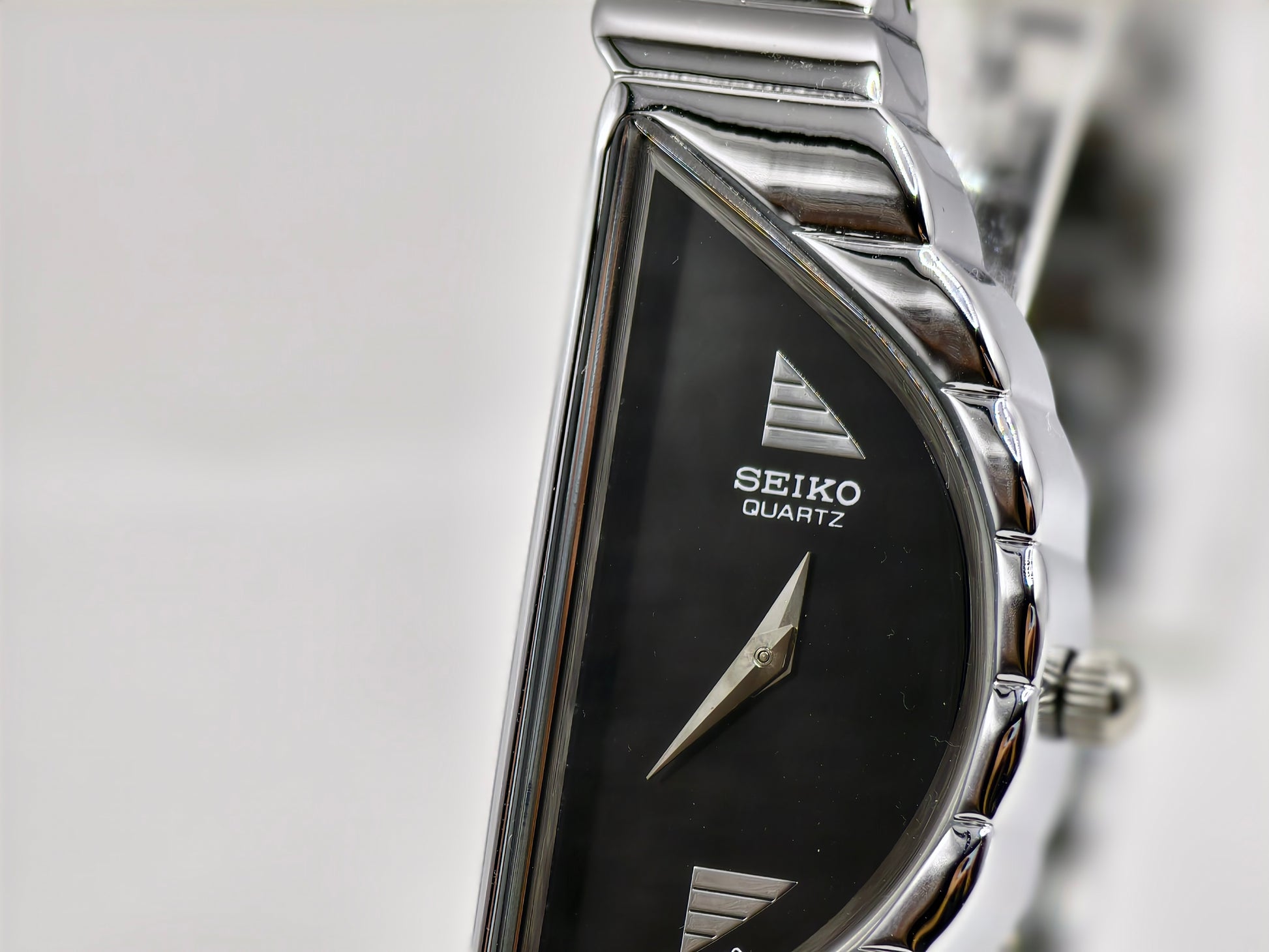 A true cult classic from the 90s. This rare Seiko features a striking asymmetrical "D-shape" case with a stepped bezel and a minimalist black dial. Blurring the line between a timepiece and architectural jewelry, this watch is a distinct statement piece that has recently surged in collectibility.