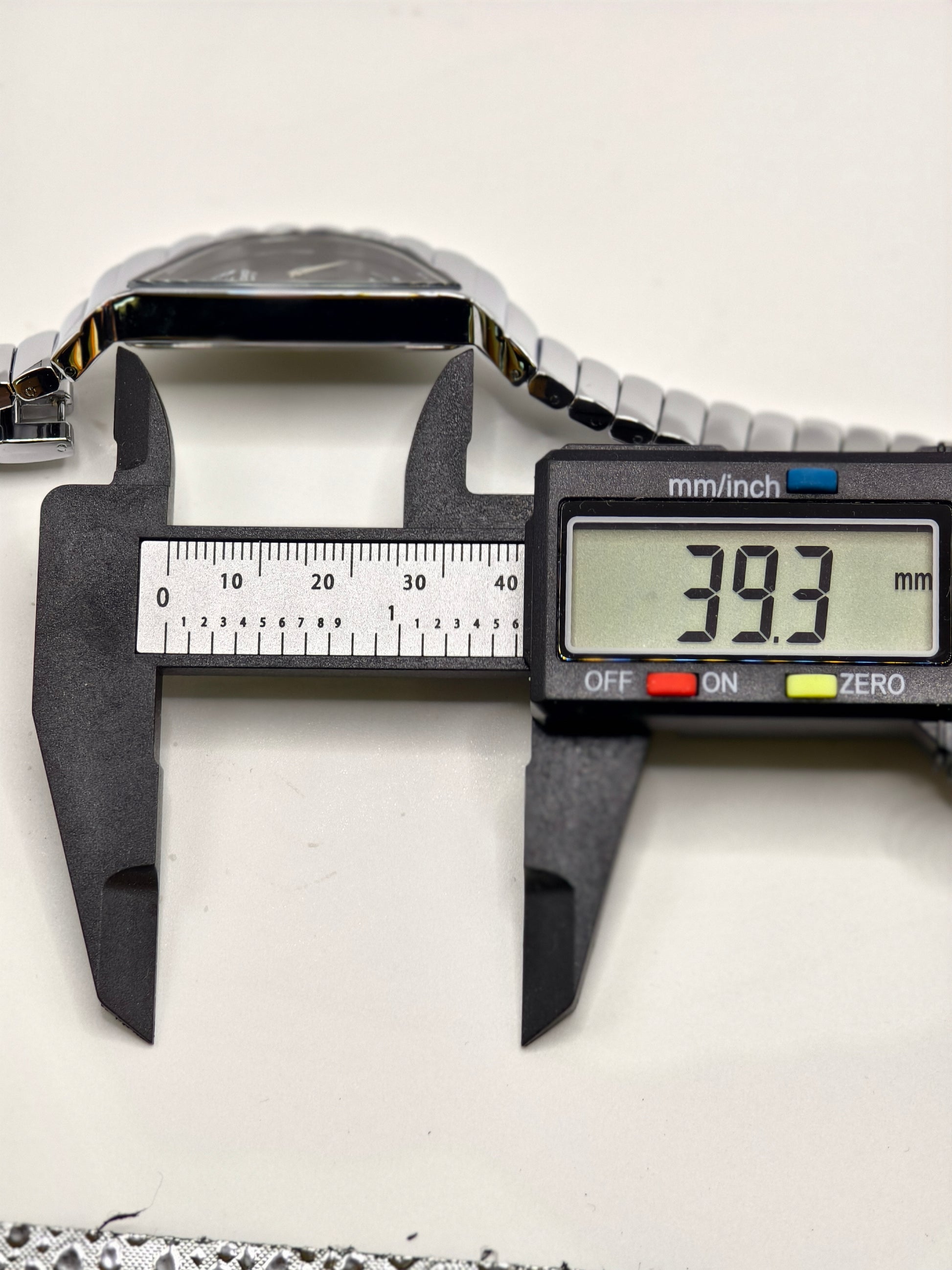 - Dial: Jet black with silver dauphine hands and geometric indices